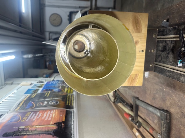 Sodele, nach langem Winterschlaf, Schaffenspause, Altbausanierung...., und ja noch dazu Opa geworden gehts weiter mit der A4. Vielen Dank an alle für die Glückwünsche, Kommentare und Meinungen zum Bau der A4. Zwischenzeitlich fand dazu eine Hochzeit statt: Booster und Innenrohr mit allen AL-Spanten und der MM sind zusammen verleimt. Flosse 1 -3 sins auch am Booster. Morgen kommt noch Flosse 4 daran. Verleimt hab ich die Flossen mit einem Montagekleber.
