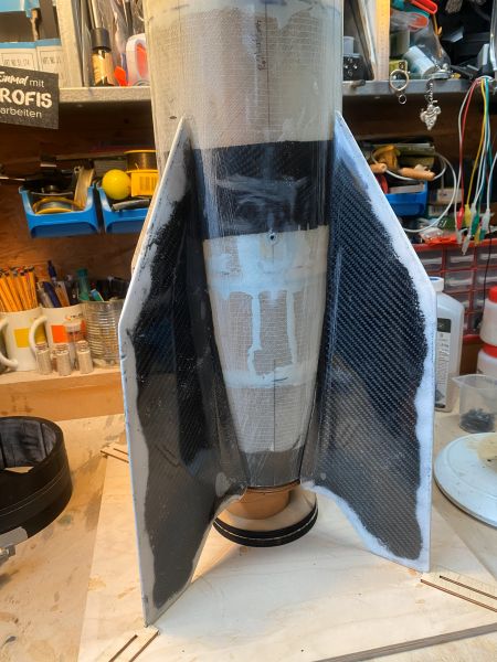 Ich bin etwas voran gekommen mit der A4 und so möchte ich Euch den aktuellen Zustand nicht vorenthalten. Finnen und Körperrohr kommen zusammen stand auf dem Plan. Und zwar so, wie vom Erbauer der Form und von Roman erfolgreich verifiziert, an das Körperrohr angeklebt..... Nun ist "Finnen einfach ankleben" ja eher etwas aus dem Low-Power Bereich, und harmoniert keinesfalls mit der geplanten Motorisierung im J-Bereich, aber ich vertraue da mal ganz Romans Erfahrung und betrete da (für mich) mal komplettes Neuland. Romans Empfehlung bezieht sich dabei auf die Wahl eines geeigneten Klebers. In meiner Welt hätte ich die Finnen mit angedickter Epoxi/Glasballonmatsche angeklebt, und aus meiner Erfahrung heraus sind die Nähte und Fillets so starr, das sie bei der erstbesten seitlichen Belastung dann einfach abbrechen oder aufbrechen. Die "erstbeste seitliche Belastung" bei einer Rakete mit dermaßen nach hinten überstehenden Finnen wäre dann auch gleich die erste Landung Heck-voran am Fallschirm hängend. Wie das immer so ist, fällt das Geraffel ja nicht in die Wiese, sondern trifft den steinharten Fahrweg neben der Wiese. Meine 4" TinTin Rakete und die 3" Jayhawk (obwohl bei weitem nicht so groß) können da ein Lied von singen. Alle vier Finnen wurden sauber entgratet, der Schaum passend runtergeschliffen und die Klebeflächen amtlich angeraut, sofern nicht durch das Abreissgewebe schon rau genug. Die Empfehlung lautete, ein langsamer oder mittelschneller, zähelastisch aushärtender Kleber auf Epoxyd-Basis. Im Raum standen da zB 3M ScotchWeld DP490 oder Araldite 20irgendwas von Huntsman. Das 3M Zeug kostet in der 50ml Doppelkartusche um 40€, gehts noch? Das Araldite-Zeug war mit 23€ wesentlich günstiger und so wurden zwei Kartuschen angeschafft, inkl. Dosierpistole und einem Dutzend Mischdüsen zum Einmalgebrauch. Für den Klebevorgang kam das präparierte Bodenbrett und der 3D gedruckte Ausrichtefuchs zum Einsatz. Ich bin restlos begeistert. Zum Einen natürlich vom Ergebnis, zum Anderen von dem Klebezeug. Sauber zu applizieren, langsam genug um sauber und überlegt zu handeln, schnell genug, um 30 Minuten später mit der nächsten Finne weiterzumachen. Überhaupt kein Vergleich zu 5 Minuten Epoxi. Außerdem absolut bombenfest, aber spürbar flexibel. Ohne mir weitere Gedanken zu machen würde ich da (wie geplant) guten Gewissens einen mittleren J-Motor reinstecken. So begeistert übrigens, das die Wracks der TinTin und der Jayhawk auch gleich noch ein paar Klebenähte verpasst bekommen haben. Das verspricht eine endlose Lackiererei zu werden, wenn hier alles fertig ist, was ich auf dem Tisch habe. Aber ich schweife ab, zurück zur A4. Ab jetzt ist zweifelsohne zu erkennen, was es werden soll. Das kann sich doch sehen lassen!? |